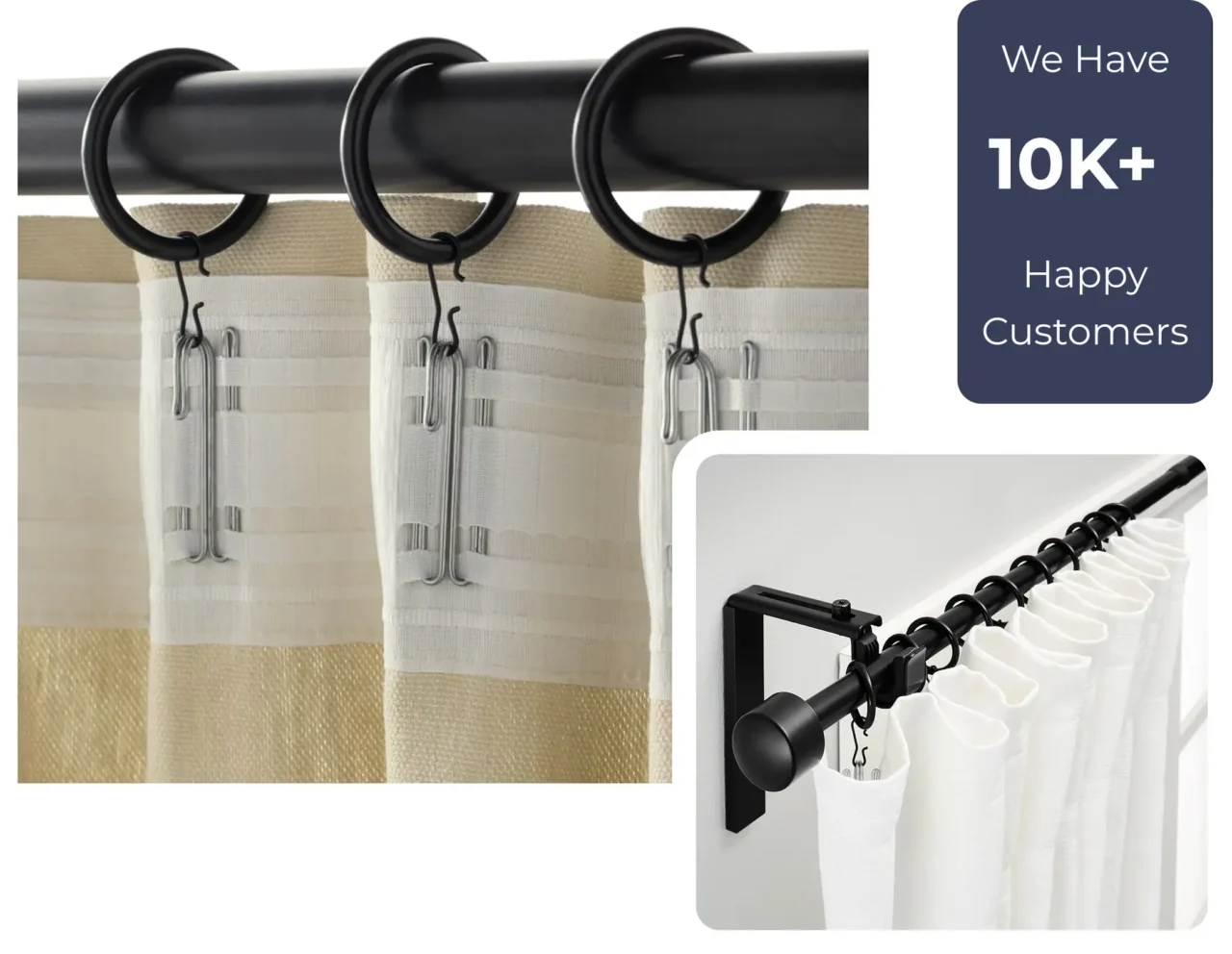 Our metal curtain rings last longer and handle heavy curtains better. However, that doesn’t mean that our premium plastic rings are of bad quality. It’s the difference in the nature of the material, i.e., plastic may wear faster, especially with daily use.