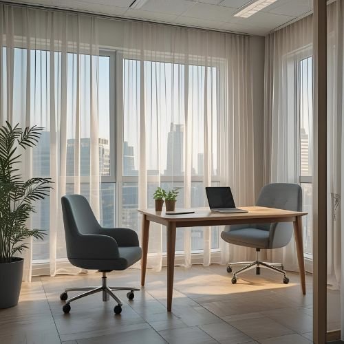 We offer modern office window solutions that blend function, durability, and a clean professional look. Our office curtains are crafted using high-quality fabrics and smart lining options that help control heat, light, and overall workspace comfort. Each curtain is designed to improve energy efficiency, protect interiors, and enhance the visual appeal of your office.