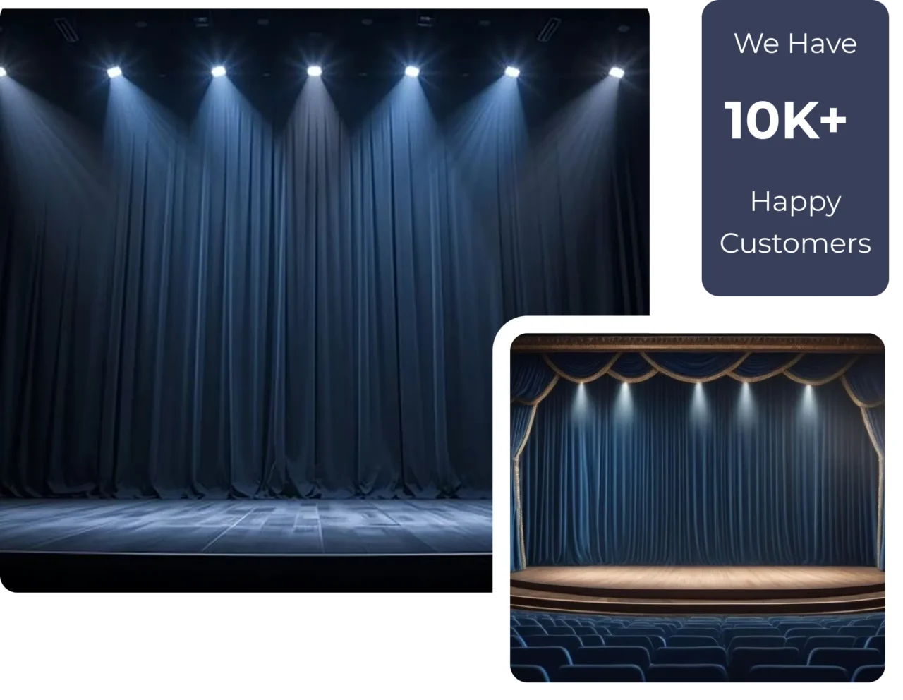 You choose from pleated styles, heavy drapes, or lighter backdrop fabric. Each option is cut and stitched to match your stage’s lighting and movement needs.
